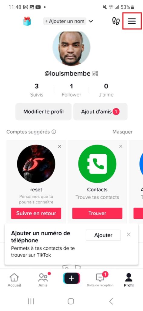 - Appuyez sur les troit traits en haut à droite