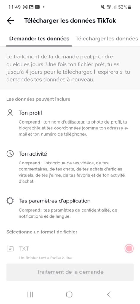 - Cliquez sur “Télécharger tes données. Reçois une copie de tes données TikTok” et appuyez sur “Traitement de la demande”.