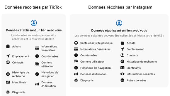 Pour l’utilisateur, un moyen aisé de mieux mesurer l’ampleur des données collectées est de se rendre sur la fiche de TikTok dans les magasins d’applications pour smartphone. Depuis plusieurs années, ces derniers résument en effet l’ensemble des autorisations d’accès réclamées par toute application, pour aller piocher des informations dans l’appareil.