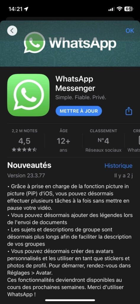 Jusqu’à présent, lorsque vous quittiez le mode plein écran ou que vous ouvriez une autre application durant un appel vidéo sur un iPhone, la vidéo était automatiquement mise en pause sur votre appareil comme sur celui de votre correspondant. Mais avec le déploiement de la version 23.3.77, la version iOS de WhatsApp est à présent d’afficher votre appel vidéo au sein d’une fenêtre déportée dès lors que vous quittez l’application. Vous pouvez ainsi répondre facilement à un message sans quitter votre appel, ou rechercher une information sur votre appareil tout en gardant un œil sur votre interlocuteur.