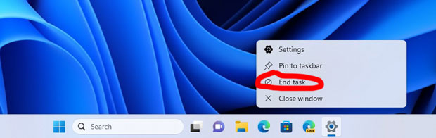 Windows 11, option Fin de tâche au niveau de la barre des tâches. (Source : WindowsLastest)