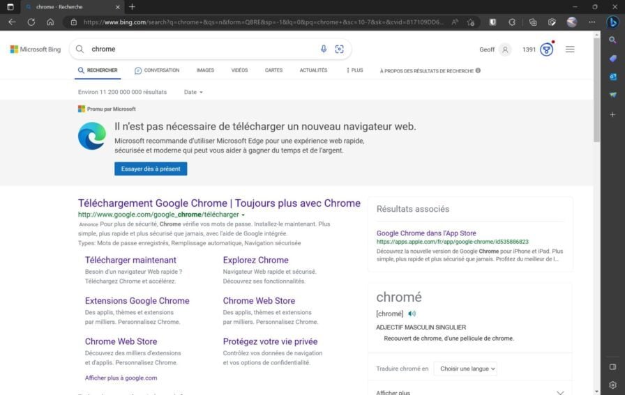 Dans un autre registre, Microsoft a aussi tenté, à plusieurs reprises, d’imposer l’utilisation de son navigateur Web Edge à la place d’un navigateur concurrent. La firme n’en a d’ailleurs pas fini avec cette pratique. En effet, encore aujourd’hui, elle continue d’afficher des messages indiquant qu’il n’est pas nécessaire de télécharger un autre navigateur Web lorsque vous cherchez à en télécharger un en utilisant Edge et Bing.